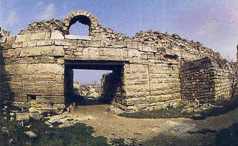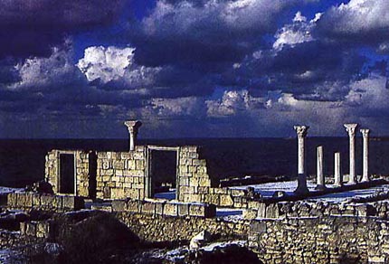 Ruins, located in the western part of Sevastopol on the Heraclian Peninsula. An important political and cultural centre of the Black Sea region. Founded by Greeks in 422-421 B.C. From 5-1 B.C. was a city-state with democratic self-government. In 3-2 B.C. the first defence structures consisting of 24 towers, 10-15 m high, were built. More than 30 streets and a large number of gardens were laid in the city. The city centre contains an acropolis and an agora (place of public meetings), a theatre, and a temple. During the 1st-4th c. Chersonese became an aristocratic republic under the control of Rome. Later it fell under Byzantine rule and in the 4th c. converted to Christianity. In the 5th-6th c. a mighty defence system was constructed. In 988 prince Volodymyr the Great captured Chersonese. In 1299 it was captured and destroyed by the Tatar-Mongols. CHERSONESE HISTORICAL-ARCHEOLOGICAL PRESERVE. Organised in 1978 with the branches of "Chembalo Fortress", "Kalamita Fortress," including the ruins of Chersonese and a museum. Back to the Crimea Photo Gallery